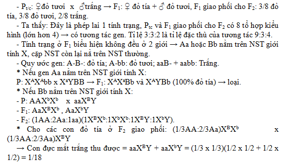 Lai ruồi giấm mắt đỏ tươi thuần chủng với ruồi đực có mắt trắng thuần chủng người ta thu được 100% ruồi cái F1 có mắt đỏ tía và 100% ruồi đực F1 có mắt đỏ tươi. Cho ruồi F1 giao phối ngẫu nhiên với nhau người ta thu được F2 với tỉ lệ phân li kiểu hình : 3/8 số ruồi F2 có mắt đỏ tía, 3/8 số ruồi F2 có mắt đỏ tươi và 2/8 sốruồi F2 có mắt trắng. Biết rằng không có hiện tượng đột biến xảy ra và không có hiện tượng gen gây chết. Nếu cho các con ruồi mắt đỏ tía ở F2 ngẫu phối thì tỉ lệ ruồi đực mắt trắng thu được là