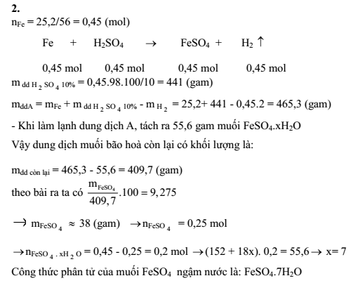 2) Hoà tan 25,2 gam kim loại Fe vào dung dịch H2SO410% loãng, vừa đủ. Sau khi kết thúc phản ứng thu được dung dịch A. Làm lạnh dung dịch A thu được 55,6 gam muối sunfat kết tinh ngậm nước của kim loại Fe tách ra và còn lại dung dịch muối sunfat bão hoà có nồng độ 9,275%. Tìm công thức của muối sunfat ngậm nước của kim loại Fe.