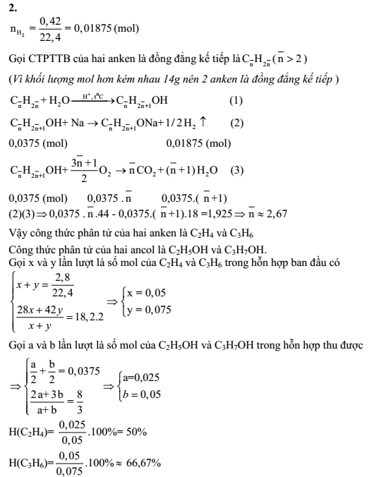 2) Cho 2,8 lít hỗn hợp khí (đktc) gồm hai anken có khối lượng mol hơn kém nhau 14 gam tác dụng với H2O, rồi tách lấy toàn bộ ancol (rượu) tạo thành. Chia hỗn hợp ancol (rượu) thành hai phần bằng nhau. Phần 1 tác dụng hết với Na tạo 420 ml H2 (đktc). Đốt cháy hoàn toàn Phần 2 thu được CO2 và H2O, trong đó khối lượng CO2 nhiều hơn khối lượng H2O là 1,925 gam.
