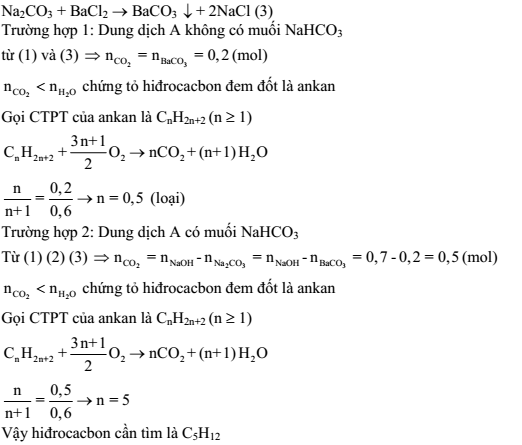 1) Người ta đốt cháy một hiđrocacbon bằng O2 dư rồi dẫn sản phẩm cháy đi lần lượt qua bình 1 đựng H2SO4 đặc rồi đến bình 2 đựng 350 ml dung dịch NaOH 2M thu được dung dịch A. Khi thêm BaCl2 dư vào dung dịch A thấy tách ra 39,4 gam kết tủa BaCO3. Khối lượng bình 1 tăng thêm 10,8 gam. Xác định công thức phân tử của hiđrocacbon.