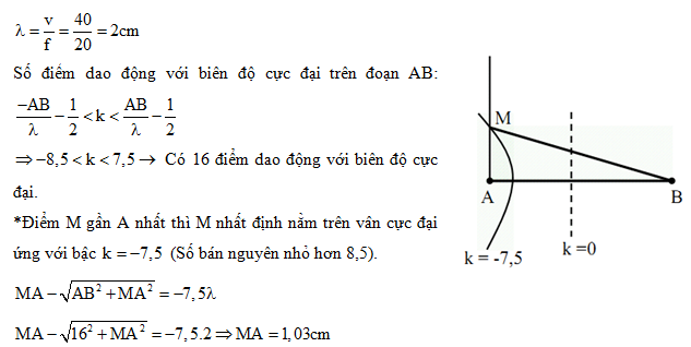 . Tốc độ truyền sóng trên mặt chất lỏng là 40 cm/s. M là một điểm trên đường thẳng Ax vuông góc với AB mà tại đó các phần tử chất lỏng dao động với biên độ cực đại. Khoảng cách AM ngắn nhất bằng