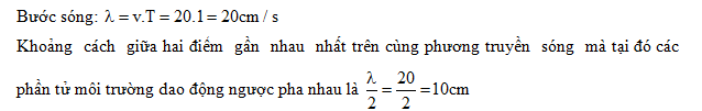 Một sóng cơ có chu kì 1 s truyền trong một môi trường với tốc độ 20 cm/s. Khoảng cách giữa hai điểm gần nhau nhất trên cùng phương truyền sóng mà tại đó các phần tử môi trường dao động ngược pha nhau là