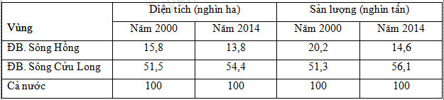 Cho bảng số liệu Diện tích và sản lượng lúa cả năm 2000 và 2014 Căn cứ vào kết quả xử