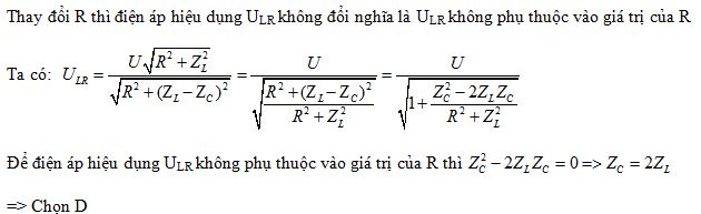 Đoạn mạch xoay chiều theo thứ tự gồm L, R, C mắc nối tiếp có R thay đổi được. Biết rằng khi thay đổi R thì điện áp hiệu dụng ULR không đổi. Ta có kết luận: