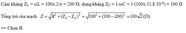Cho mạch điện RLC mắc nối tiếp, tần số dòng điện f = 50Hz, cuộng dây thuần cảm L = 2/π H, C = 31,8 µF, R = 100 Ω. Tổng trở của đoạn mạch là