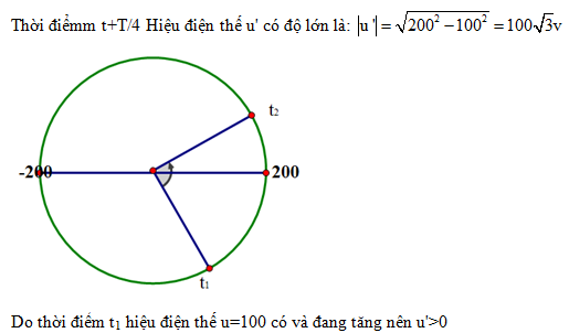 . Tại thời điểm t, hiệu điện thế u = 100(V) và đang tăng. Hỏi vào thời điểm (t + T/4), hiệu điện thế u bằng