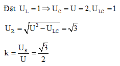 Cho đoạn mạch điện gồm điện trở R , cuộn dây thuần cảm L và tụ điện C mắc nối tiếp. Đặt vào hai đầu đoạn mạch điện áp xoay chiều có tần số và điện áp hiệu dụng không đổi. Dùng vôn kế nhiệt có điện trở rất lớn lần lượt đo điện áp giữa hai đầu đoạn mạch, hai đầu tụ điện và hai đầu cuộn dây thì số chỉ của vôn kế có giá trị tương ứng là U, UC và UL. Biết U = UC = 2UL. Hệ số công suất của mạch điện bằng: