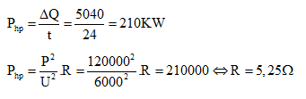 Ở trạm phát điện, người ta truyền đi công suất 1,2 MW dưới điện áp 6 KV. Số chỉ các công tơ ở trạm phát và nơi tiêu thụ điện sau một ngày đêm chênh lệch nhau 5040 KW.h. Điện trở của đường dây tải điện là: