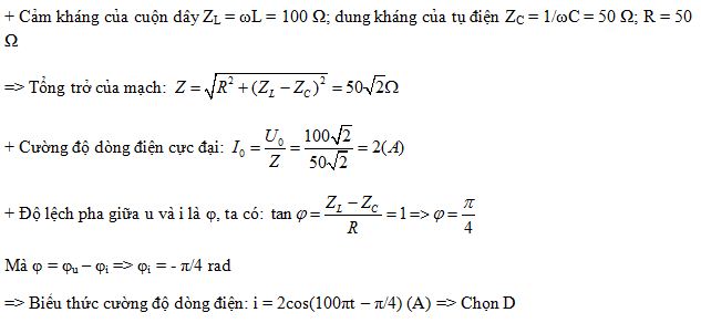 Cho mạch điện xoay chiều RLC mắc nối tiếp gồm điện trở R = 50 Ω, cuộn dây thuần cảm L = 1/π H, C = 2.10-4/π F, biểu thức điện áp hai đầu đoạn mạch là . Biểu thức dòng điện trong mạch là