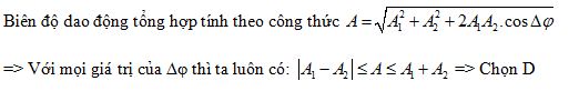 Hai dao động điều hòa cùng phương, cùng tần số, có độ lệch pha ∆φ. Biên độ của hai dao động lần lượt là A1 và A2. Biên độ dao động tổng hợp A thỏa mãn