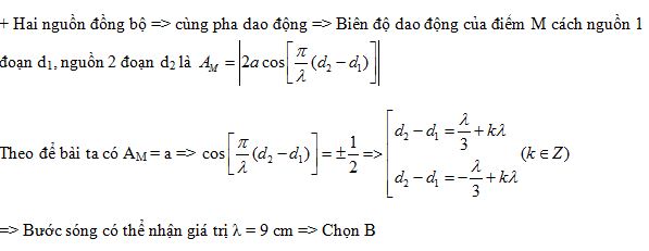 Trong hiện tượng giao thoa sóng trên mặt nước, hai nguồn đồng bộ có cùng biên độ 3 cm. Phương trình dao động tại điểm M có hiệu khoảng cách đến hai nguồn là 6 cm có dạng uM = 3cos(20πt) cm. Bước sóng có thể nhận giá trị nào sau đây: