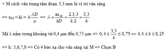 Trong thí nghiệm Young về giao thoa ánh sáng, biết D = 2m; a = 2mm. Hai khe được chiếu bằng ánh sáng trắng( có bước sóng từ 0,4 μm đến 0,75 μm). Tại điểm trên màn quan sát cách vân trắng chính giữa 3,3 mm có bao nhiêu bức xạ cho vân sáng tại đó?