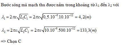 Một mạch dao động LC lý tưởng có điện dụng C của tụ điện biến thiên từ 10pF đến 500 pF và hệ số tự cảm L của cuộn dây biến thiên từ 0,5 μH đến 10 μH. Mạch có thể thu được sóng điện từ có bước sóng trong khoảng