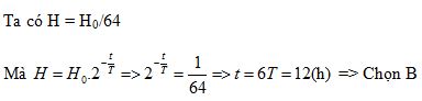 Một nguồn phóng xạ nhân tạo vừa được tạo thành có chu kỳ bán rã là T=2h, có độ phóng xạ lớn hơn mức cho phép 64 lần. Thời gian tối thiểu để ta có thể làm việc an toàn với nguồn phóng xạ này là: