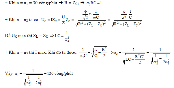 Một máy phát điện xoay chiều một pha có roto làm bằng nam châm điện có một cặp cực quay đều với tốc độ n vòng/phút. Một đoạn mạch gồm điện trở thuần R, cuộn cảm thuần L và tụ điện C mắc nối tiếp được mắc vào hai cực của máy. Coi rằng các cuộn dây của máy phát điện có điện trở không đáng kể. Khi roto quay với tốc độ n1 = 30 vòng/phút thì dung kháng của tụ điện bằng R. Khi roto quay với tốc độ n2 = 40 vòng/phút thì điện áp hiệu dụng ở hai đầu tụ điện đạt giá trị cực đại. Bỏ qua điện trở thuần của các cuộn dây phần ứng. Để cường độ dòng điện hiệu dụng trong mạch đạt giá trị cực đại thì roto phải quay với tốc độ bằng