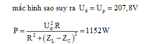 Một máy phát điện xoay chiều ba pha mắc hình sao có điện áp dây là 207,8V. Tải được mắc hình sao và tải của các pha giống nhau và có điện trở thuần 24Ω , cảm kháng cuộn cảm 30 Ω và dung kháng tụ điện 12 Ω mắc nối tiếp. Công suất tiêu thụ của dòng trên mỗi pha là