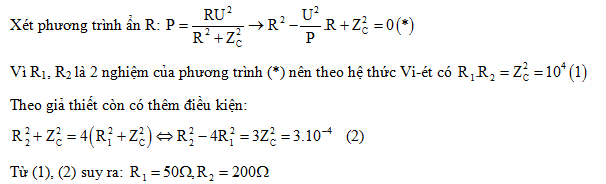 Đặt điện áp xoay chiều có giá trị hiệu dụng không đổi vào hai đầu đoạn mạch gồm biến trở R mắc nối tiếp với tụ điện. Dung kháng của tụ điện là100Ω . Khi điều chỉnh R thì tại hai giá trị R1 và R2 công suất tiêu thụ của đoạn mạch như nhau. Biết điện áp hiệu dụng giữa hai đầu tụ điện khi R=R1 bằng hai lần điện áp hiệu dụng giữa hai đầu tụ điện khi R = R2. Các giá trị R1 và R2 là: