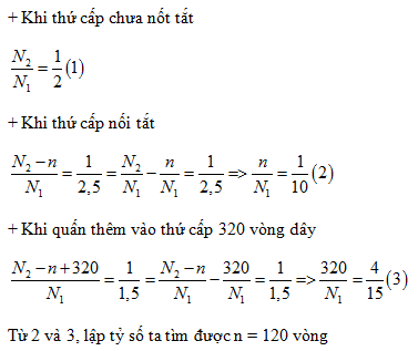 Cuộn thứ cấp của một máy biến áp lí tưởng được nối với một điện áp xoay chiều có giá trị hiệu dụng không đổi. Lúc mới sử dụng tỉ số điện áp hiệu dụng của cuộn sơ cấp và cuộn thứ cấp bằng 2. Sau một thời gian sử dụng, do lớp cách điện kém nên n vòng dây cuộn thứ cấp bị nối tắt, tỉ số điện áp nói trên bây giờ là 2,5. Để xác định n, một học sinh quấn thêm vào cuộn thứ cấp 320 vòng dây cùng chiều quấn ban đầu thì tỉ số điện áp đo được là 1,5. Giá trị n bằng