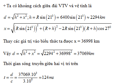 Vệ tinh VINASAT – 1 có tọa độ địa lý 1320 kinh Đông, vệ tinh ở độ cao 35927 km so với mặt đất. Đài truyền hình Việt Nam (VTV) có tọa độ 210 vĩ Bắc, 1050 kinh Đông. Coi Trái Đất có dạng hình cầu đồng chất bán kính 6400 km, tốc độ truyền sóng điện từ là 3.108 m/s. Thời gian kể từ lúc VTV phát tín hiệu sóng cực ngắn đến khi VINASAT – 1 nhận được là