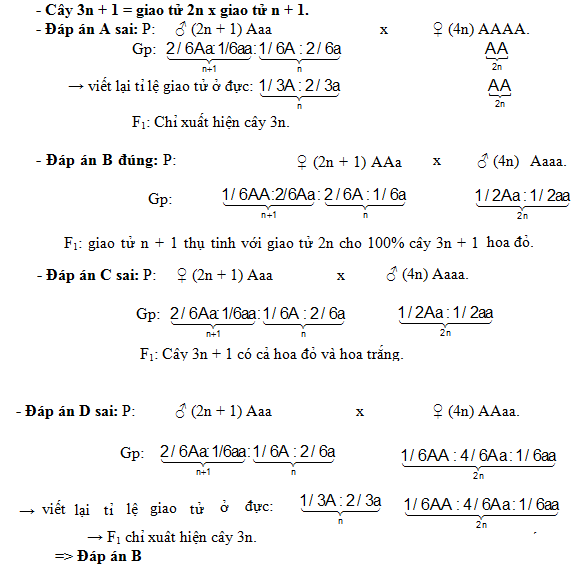 Ở một loài thực vật, gen A – trội hoàn toàn quy định màu hoa đỏ; gen lặn a – hoa trắng. Biết rằng hạt phấn (n+1) của cây thể ba (2n+1) không tham gia thụ tinh. Phép lai nào sau đây tạo ra kết quả ở đời sau có các cây (3n+1) toàn ra hoa đỏ?