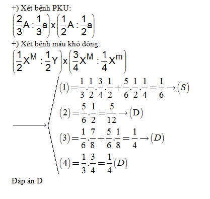 Ở người, bệnh phêninkêtô niệu do một trong hai alen của gen nằm trên nhiễm sắc thể thường; bệnh máu khó đông do một trong hai alen của gen nằm trên đoạn không tương đồng của nhiễm sắc thể X qui định. Theo dõi sự di truyền của hai bệnh trong một gia đình qua hai thế hệ được thể hiện qua sơ đồ phả hệ dưới đây.
