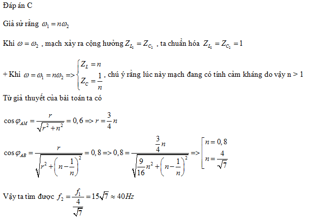 Một đoạn mạch AB gồm một cuộn dây và một tụ điện theo thứ tự đó mắc nối tiếp. M là điểm nằm chính giữa cuộn dây và tụ điện. Đặt vào hai đầu đoạn mạch một điện áp xoay chiều có tần số thay đổi đượC. Khi tần số là f1 = 60 Hz thì hệ số công suất của đoạn AM là 0,6; của đoạn AB là 0,8 và mạch có tính cảm kháng. Khi tần số của dòng điện là f2 thì trong mạch có cộng hưởng điện, f2 gần nhất với giá trị nào sau đây?