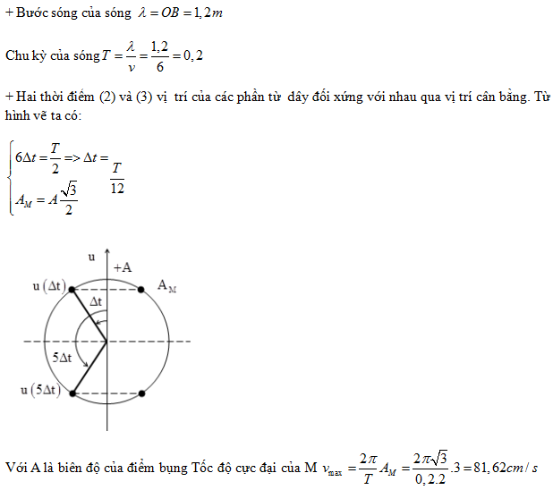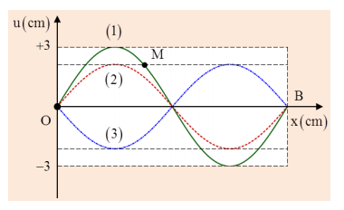 Sóng dừng ổn định trên sợi dây có chiều dài L = OB =1,2 m với hai đầu O và B là hai nút sóng. Tại thời điểm t = 0, các điểm trên sợi dây có li độ cực đại và hình dạng sóng là đường (1), sau đó một khoảng thời gian ∆t và 5∆t các điểm trên sợi dây chưa đổi chiều chuyển động và hình dạng sóng tương ứng là đường (2) và (3). Tốc độ truyền sóng trên dây bằng 6 m/s. Tốc độ cực đại của điểm M là