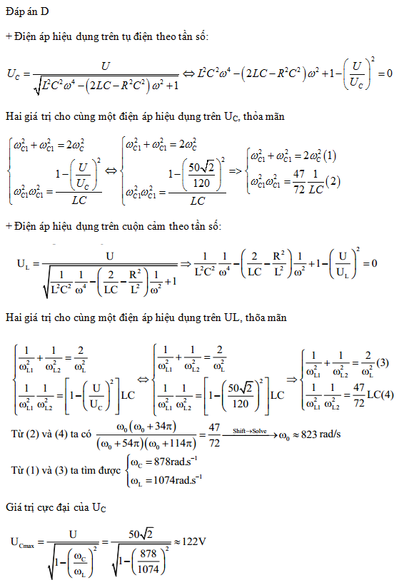 Đặt vào hai đầu đoạn mạch AB (gồm điện trở thuần, cuộn cảm thuần L, tụ điện C mắc nối tiếp) một điện áp xoay chiều u = 100cos2πft V (tần số f thay đổi được). Khi tần số là f0 hoặc f0 +17 Hz thì điện áp hiệu dụng trên tụ điện bằng nhau và bằng UC = 120V. Khi tần số là f0 +27 hặc f0 +57 Hz thì điện áp hiệu dụng trên cuộn dây bằng nhau và bằng UL = 120 Hz . Khi f = fC thì điện áp hiệu dụng trên hai đầu tụ điện là cực đại UCmax . Giá trị UCmax gần nhất với giá trị nào sau đây?