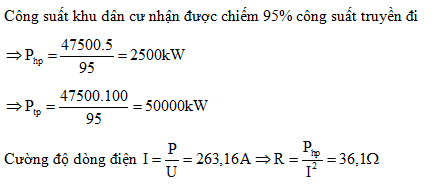Điện năng được truyền từ nhà máy tới một khu dân cư bằng đường dây truyền tải một pha có hệ số công suất của đường dây bằng 1. Đường dây làm tiêu hao 5% công suất cần tải nên ở khu dân cư chỉ còn nhận được công suất 47500 kW với điện áp hiệu dụng là 190 kV. Điện trở của đường dây bằng