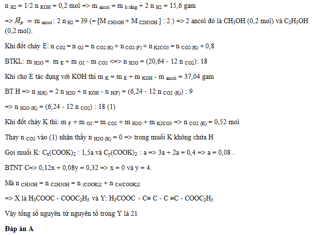 Đốt cháy X cũng như Y với lượng oxi vừa đủ, luôn thu được CO2 có số mol bằng số mol O2 đã phản ứng. Biết rằng X, Y (MX< MY) là hai este đều mạch hở, không phân nhánh và không chứa nhóm chức khác. Đun nóng 30,24 gam hỗn hợp E chứa X, Y (với n X = 1,5 n Y) cần dùng 400 ml dung dịch KOH 1M, thu được hỗn hợp F chứa 2 ancol đơn chức đồng đẳng kế tiếp và hỗn hợp K chứa 2 muối. Dẫn toàn bộ F qua bình đựng Na dư thấy khối lượng bình tăng 15,2 gam. Đốt cháy hoàn toàn hỗn hợp K cần dùng 0,42 mol O2. Tổng số nguyên tử có trong Y là: