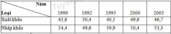 Dựa vào bảng số liệu sau đây về cơ cấu giá trị xuất nhập khẩu của nước ta thời kì 1990 - 2005. (Đơn vị : %)