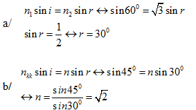 b/ Nếu chiếu tia sáng từ không khí vào một môi trường trong suốt khác có chiết suất n với góc tới bằng 450 thì góc khúc xạ là 300. Tính chiết suất n.