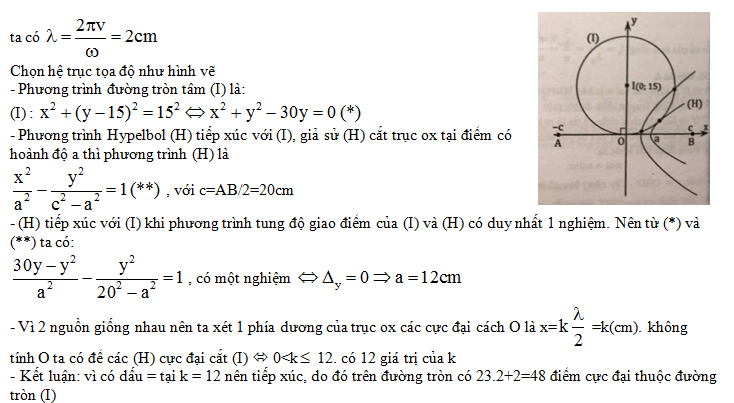 ( t đo bằng giây). Tốc độ truyền sóng trên mặt nước là 0,4m/s. Gọi O là điểm nằm trên đường trung trực của AB, I cách trung điểm O của AB một khoảng 15cm. Trên đường tròn tâm I, bán kính 15cm, số điểm dao động với biên độ cực đại là