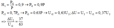 Một công ty điện lực dùng đường dây tải điện với công suất truyền tải không đổi để cấp điện cho một khu dân cư với hiệu suất truyền tải 90%. Sau nhiều năm, dân cư ở khu vực đó giảm khiến công suất tiêu thụ điện tại khu dân cư đó giảm xuống 0,7 lần so với ban đầu trong khi vẫn phải sử dụng hệ thống đường dây tải điện cũ. Biết rằng hao phí trên đường dây tải điện có nguyên nhân chủ yếu là do sự tỏa nhiệt trên đường dây bởi hiệu ứng Joule - Lentz, hệ số công suất của mạch điện bằng 1. Độ giảm hiệu điện thế trên dây bằng bao nhiêu lần hiệu điện thế trên tải khi dân cư đã thay đổi.