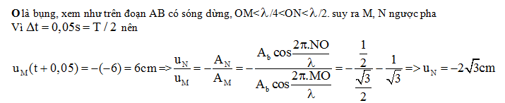 Có hai nguồn sóng kết hợp A, B trên mặt nước, cùng pha, cùng biên độ, tần số dao động f = 10 Hz, coi biên độ sóng không đổi khi truyền đi. Biết bước sóng là Gọi O là trung điểm của AB, trên OA có hai điểm M, N cách O lần lượt là 1 cm và 4 cm. Tại thời điểm M có li độ -6 cm thì tại thời điểm (t + 0,05) (s) N có li độ