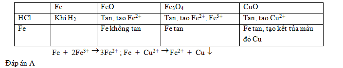 Bằng phương pháp hóa học. Hãy chọn một hóa chất thích hợp để nhận biết các chất rắn (dạng bột) sau: Fe, FeO, Fe3O4, CuO.