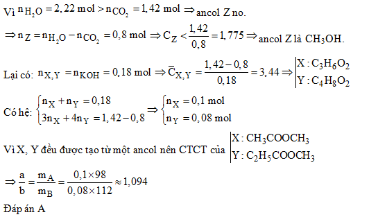X, Y là hai este no, đơn chức, hở, thuộc cùng dãy đồng đẳng liên tiếp và đều được tạo thành từ một ancol Z. Đốt cháy hết hỗn hợp H gồm X, Y, Z trong oxi, thu được 62,48g CO2 và 39,96g H2O. Mặt khác, H tác dụng vừa đủ với 100 ml dung dịch KOH 1,8M, cô cạn dung dịch sau phản ứng thu được a gam muối A; b gam muối B. Biết MA < MB. Tỉ lệ a : b có giá trị là