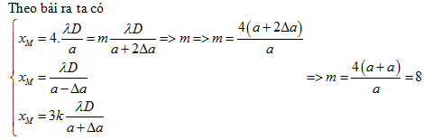 Trong thí nghiệm Y-âng về giao thoa với ánh sáng đơn sắc, màn quan sát cách mặt phẳng chứa hai khe hẹp một khoảng không đổi D, a là khoảng cách giữa hai khe hẹp thay đổi được. Xét điểm M trên màn lúc đầu là vân sáng bậc 4. Nếu giảm hoặc tăng khoảng cách giữa hai khe hẹp một lượng \(\Delta a\) thì tại M là vân sáng bậc k và vân sáng bậc 3k. Nếu tăng khoảng cách giữa hai khe hẹp thêm một lượng 2 thì tại M là
