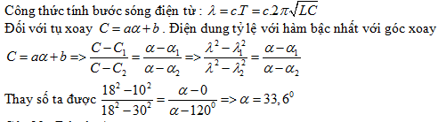 Mạch chọn sóng của một máy thu vô tuyến ở lối vào có mạch dao động gồm một cuộn cảm thuần có độ tự cảm L xác định và một tụ điện là tụ xoay có điện dung thay đổi được theo quy luật hàm số bậc nhất của góc xoay α của bản linh động. Khi α = 00 mạch thu được sóng điện từ có bước sóng là 10m. Khi α = 1200 mạch thu được sóng điện từ có bước sóng là 30m. Để mạch này thu được sóng điện từ có bước sóng bằng 18m thì α bằng