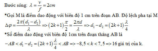 Trên mặt nước tại hai điểm A, B cách nhau 8 cm có hai nguồn sóng cơ kết hợp, dao động theo phương thẳng đứng với phương trình uA = 6cos(40pt) và uB = 8cos(40pt ) (uA và uB tính bằng mm, t tính bằng s). Biết tốc độ truyền sóng trên mặt nước là 40cm/s, coi biên độ sóng không đổi khi truyền đi. Số điểm dao động với biên độ 1cm trên đoạn thẳng AB là