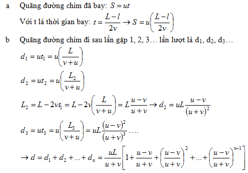 Hai chiếc tàu thủy chuyển động hướng tới nhau trên một đường thẳng với cùng tốc độ v. Kích thước các tàu rất nhỏ so với khoảng cách giữa chúng. Khi hai tàu cách nhau một khoảng L thì một con chim hải âu từ tàu A bay đến gặp tàu B (lần gặp 1), khi tới tàu B nó bay ngay lại tàu A (lần gặp 2), khi tới tàu A nó bay ngay lại tàu B (lần gặp 3) … và cứ tiếp tục như vậy cho đến khi hai tàu gặp nhau. Biết chim luôn bay với tốc độ u không đổi đối với đất (u > v). Tính quãng đường con chim hải âu đã bay được cho đến khi: