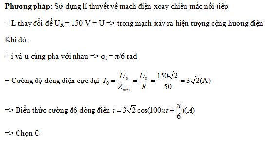 cos(100πt+π/6) (V). Thay đổi L để điện áp hai đầu điện trở có giá trị hiệu dụng UR=150V. Biểu thức nào sau đây đúng cho cường độ dòng điện qua mạch: