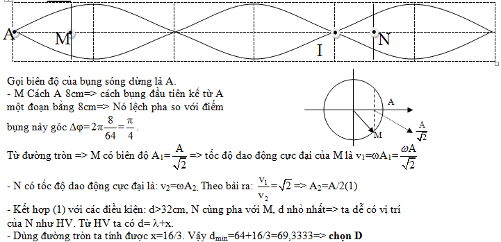=64cm. Xét hai điểm M và N trên dây. Khi sợi dây duỗi thẳng M, N lần lượt cách A những khoảng 8cm và d cm (d>32cm) dao động với tốc độ cực đại là v1 và v2. Biết