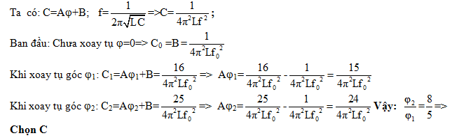Mạch chọn sóng của máy thu vô tuyến gồm tụ xoay C và cuộn thuần cảm L. Tụ xoay có điện dung C tỉ lệ theo hàm số bậc nhất đối với góc xoay φ. Ban đầu khi chưa xoay tụ thì mạch thu được sóng có tần số f0. Khi xoay tụ một góc φ1 thì mạch thu được sóng có tần số f1 = f0/4. Khi xoay tụ một góc φ2 thì mạch thu được sóng có tần số f2 = f0/5. Tỉ số giữa hai góc xoay là