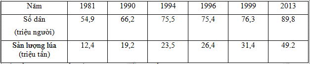 Cho bảng số liệu: Số dân và sản lượng lúa ở nước ta thời kì 1981 – 2003