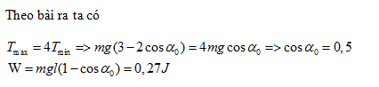 Con lắc đơn có chiều dài dây treo là 90 cm, khối lượng vật nặng bằng 60 g, dao động tại nơi có gia tốc trọng trường g = 10 m/s2. Biết độ lớn lực căng cực đại của dây treo lớn gấp 4 lần độ lớn lực căng cực tiểu của nó. Bỏ qua mọi ma sát, chọn gốc thế năng ở vị trí cân bằng. Cơ năng dao động của con lắc bằng