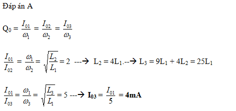 Một tụ điện có điện dung C tích điện Q0. Nếu nối tụ điện với cuộn cảm thuần có độ tự cảm L1 hoặc với cuộn cảm thuần có độ tự cảm L2 thì trong mạch có dao động điện từ tự do với cường độ dòng điện cực đại là 20mA hoặc 10mA. Nếu nối tụ điện với cuộn cảm thuần có độ tự cảm L3=(9L1 + 4L2) thì trong mạch có dao động điện từ tự do với cường độ dòng điện cực đại là