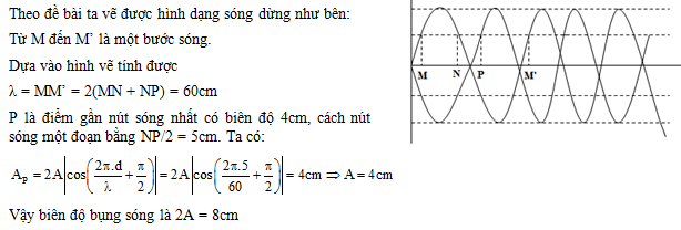 Trên một sợi dây đàn hồi đang có sóng dừng ổn định. Ba điểm M, N, P là ba điểm liên tiếp trên dây dao động với cùng biên độ 4 cm, biết M, N dao động cùng pha, N,P dao động ngược pha. Khi các điểm qua vị trị cân bằng khoảng cách MN = 2NP = 20 cm. Biên độ của bụng sóng và bước sóng:
