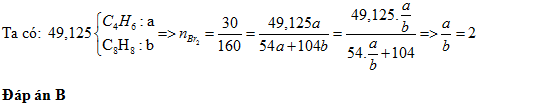 Cứ 49,125 gam cao su buna-S phản ứng vừa hết với 30 gam brom trong CCl4. Tỉ lệ số mắt xích stiren