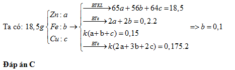 Hỗn hợp X gồm Zn, Fe, Cu. Cho 18,5 gam hỗn hợp X tác dụng với dung dịch HCl dư thu được 4,48 lit H2(đktc). Mặt khác cho 0,15 mol hỗn hợp X phản ứng vừa đủ với 3,92 lít khí Cl2 (đktc). Số mol Fe có trong 18,5 gam hỗn hợp X là